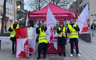 Die NGG hat in dieser Woche unter dem Motto "Ohne uns kein Service – Hotel- und Gastrobeschäftigte kämpfen für faire Löhne“ zahlreiche öffentlichkeitswirksame Aktionen durchgeführt: unter anderem in Ulm (Foto), Stuttgart, Mannheim, Heilbronn, Freiburg und Baden-Baden.